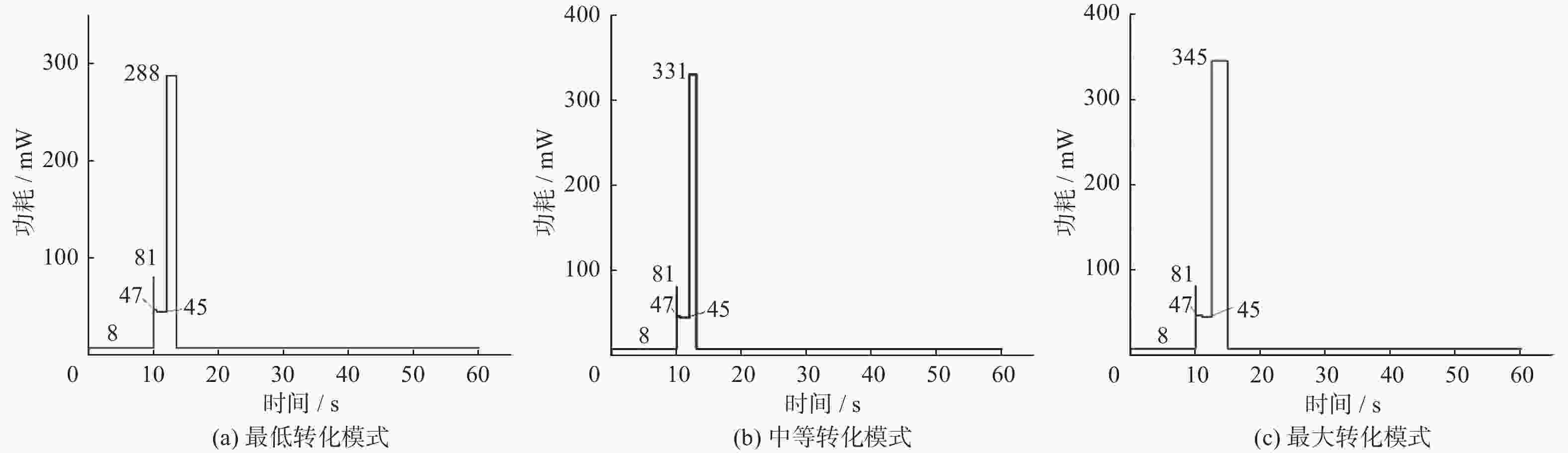 管理电路关闭时间0 s 空中速率40 KB/s 休眠时间54.99 s 串口速率 38400 运行时间5.01 s 接收功率52.8 mW 无线组网电路 关闭时间0 s 发射功率100 mW 休眠时间54.99 s — 待机时间2.5 s — 接收时间10 ms — 发送时间2.5 s 表 3 中等转化模式的优化匹配结果