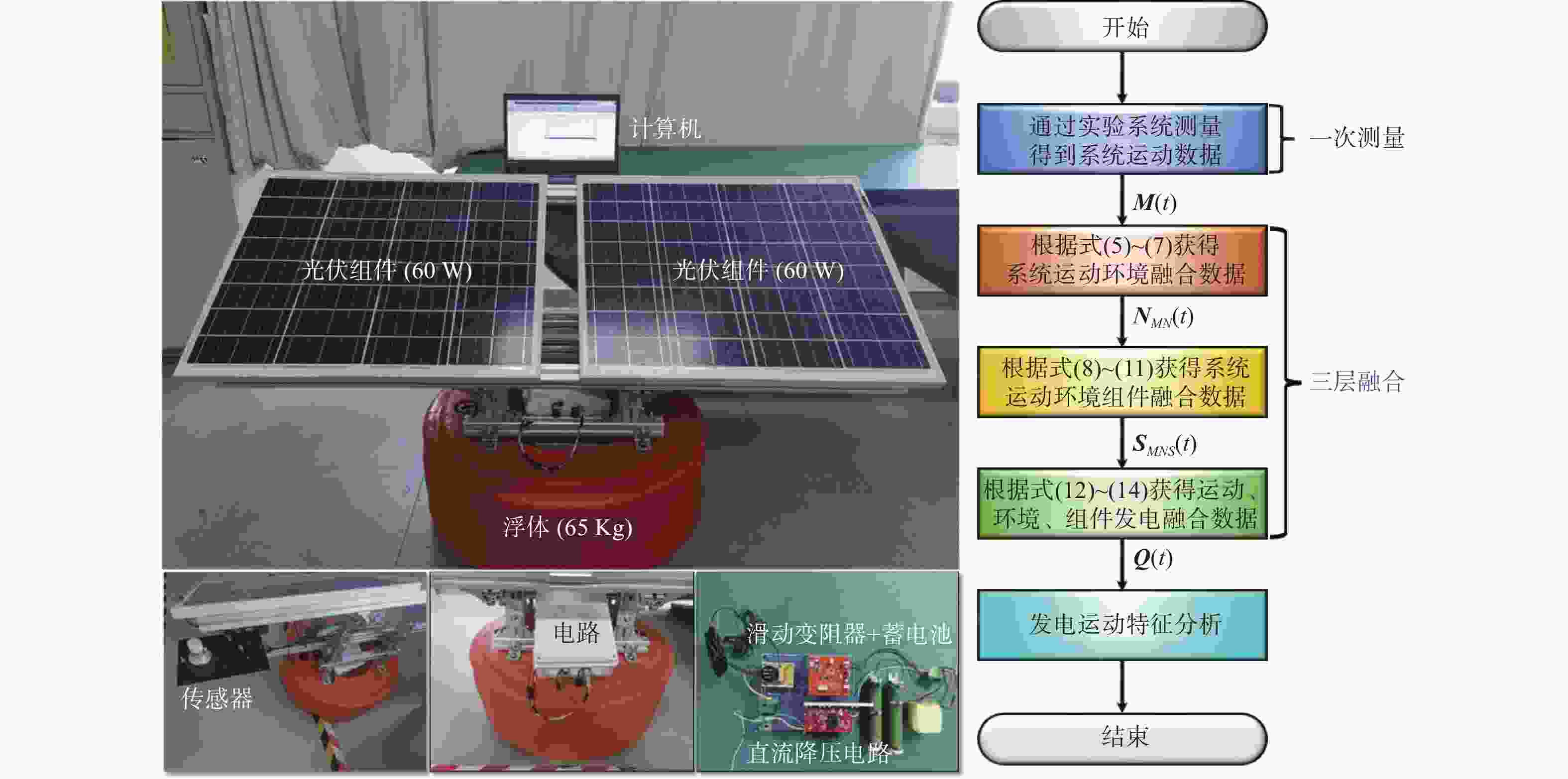 • 摘要: 相比陆基式光伏发电系统,海上漂浮式光伏系统发电耦合了运动特征,输出功率呈现复杂随机性。为获取海上漂浮式光伏系统的发电运动特征,提出一种“一次测量三层融合”的数字化方法,即利用运动、环境、组件和发电数据表征系统耦合因素,通过测量获取运动数据,依次实现运动到环境、环境到组件、组件到发电的三层数据融合,并通过搭建实验系统,验证数字融合方法的有效性。结果表明,与实测数据相比,融合方法的最大偏差为1.11 W,最大相对偏差为1%。相较于静态时,运动造成系统整体功率减少1.14 W,降低5.06%;功率最大减少3.27 W,最大降低13.30%,为提高海上漂浮式光伏发电效率提供了有效途径。