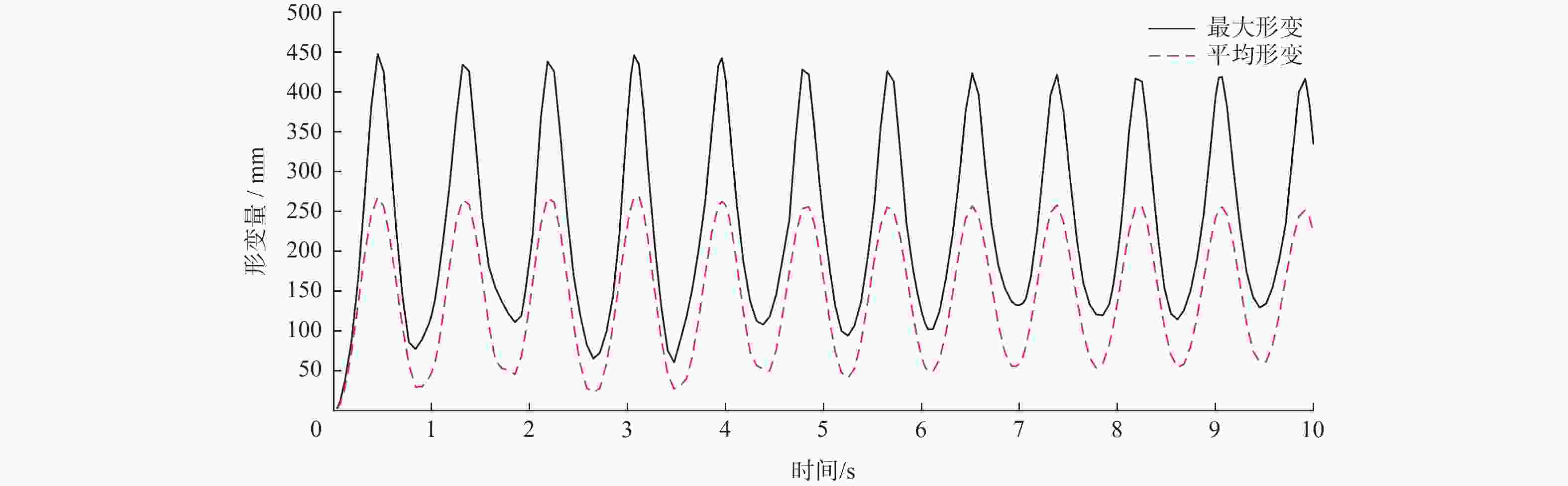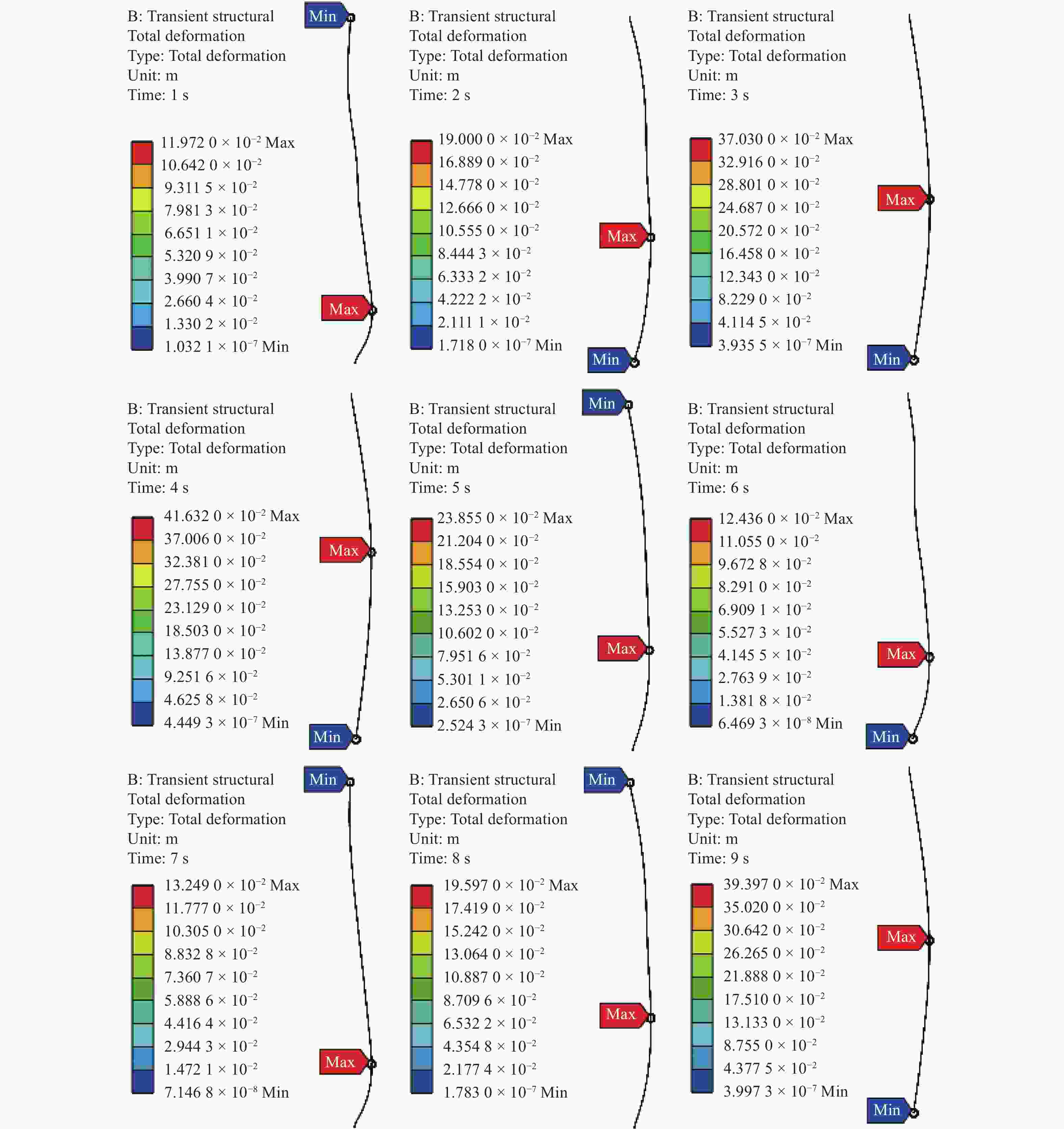 摘要: 为探究系留无人机(UAV)的气动性能以及线缆的变形情况,进行系留无人机的动力响应分析。构建系留无人机模型,采用流−固耦合的分析方法、标准k-ε湍流模型和滑移网格技术进行数值模拟,研究不同风速下侧风对系留无人机系统的动力学性能。结果表明,随着侧向风速增加,涡强度显著增加,来风一侧尤为明显。系缆在风力和自身重力的共同作用下发生形变,最大形变量出现在特定位置,且随风速变化而变化,最大形变量为448 mm,10 s内整体平均形变量为145 mm。这一结果可为系留无人机的设计和使用条件提供参考。Abstract: In order to investigate the aerodynamic performance of the tethered unmanned aerial vehicle (UAV) and the deformation of the tether, the dynamic response analysis of the tethered UAV was conducted. A tethered UAV model was developed, and numerical simulations were performed using using a fluid-structure interaction (FSI) analysis method, standard k-ε turbulence model, and slip-grid technology. The dynamic performance of the tethered UAV system under crosswinds at different wind speeds was investigated. The results shows that the vortex strength increases significantly with crosswind speed, particularly on the windward side. The tether deformed under the combined effect of wind and its gravity, and the maximum deformation occurs at a specific location and varies with wind speed. The maximum deformation was 448 mm, and the overall average deformation was 145 mm in 10 s. It can be used as a reference for the design and utilization conditions of tethered UAVs.