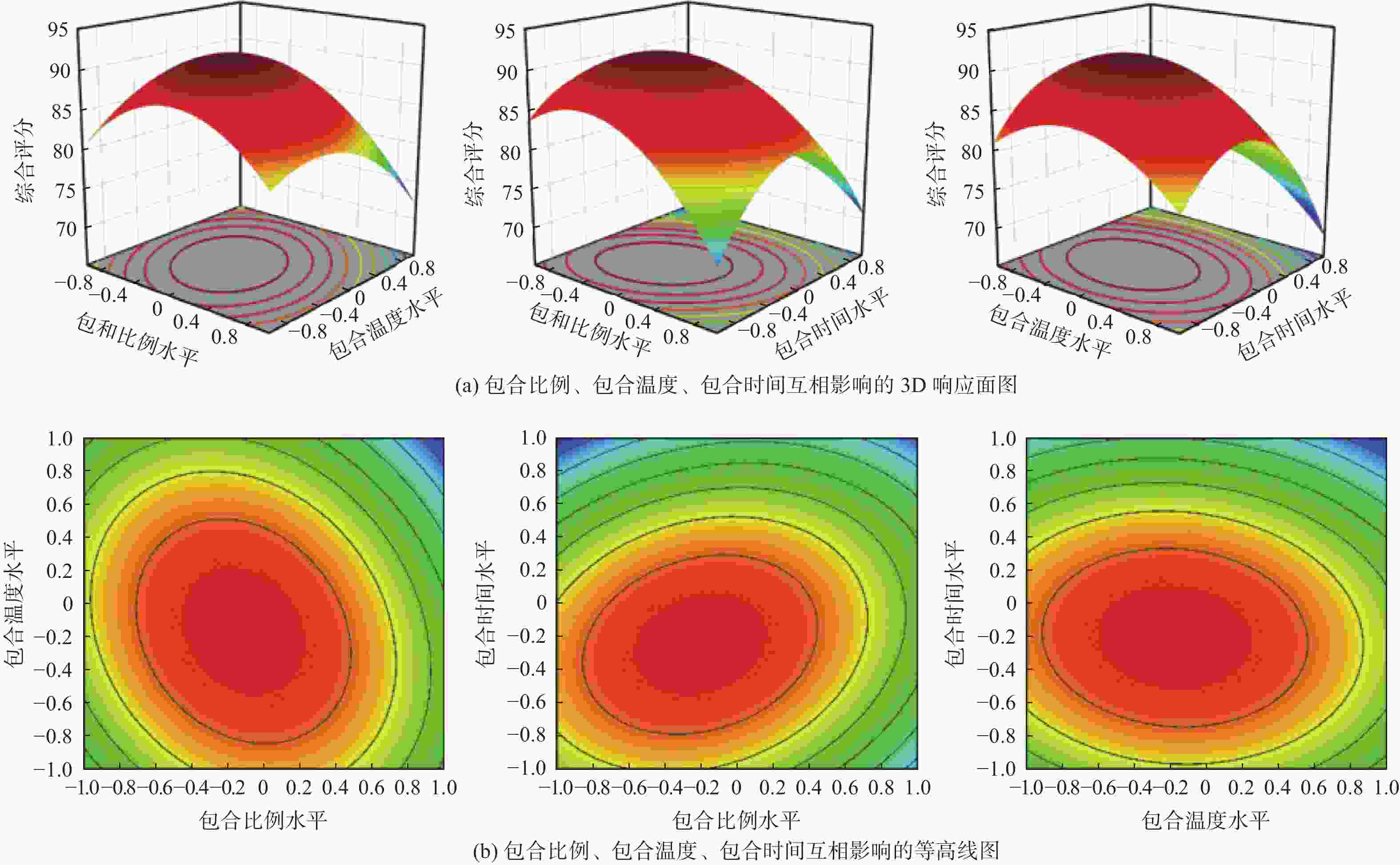 实验号 A B C 含油率/% 包合率/% 收率/% 综合评分 1 −1 −1 0 27.60 17.36 69.63 79.86 2 1 −1 0 33.71 14.47 69.06 77.88 3 0 −1 1 28.59 15.97 53.05 72.84 4 −1 0 −1 39.06 19.82 69.65 94.21 5 0 0 0 29.71 14.22 61.94 72.24 6 1 0 1 21.82 13.9 68.75 67.39 7 1 0 −1 28.26 15.79 63.29 75.05 8 −1 1 0 29.64 15.28 57.50 73.33 9 0 −1 −1 33.84 16.84 71.06 83.37 10 0 1 −1 29.29 16.55 62.58 77.34 11 −1 0 1 29.31 19.16 67.00 84.50 12 0 0 0 37.31 22.21 59.40 95.36 13 0 0 0 23.31 13.40 61.52 65.37 14 1 1 0 35.92 19.31 65.76 89.55 15 0 0 0 28.3 17.91 69.19 81.52 16 0 0 0 34.42 18.71 65.05 84.84 17 0 1 1 35.4 20.70 60.46 90.79 表 3 方差分析结果