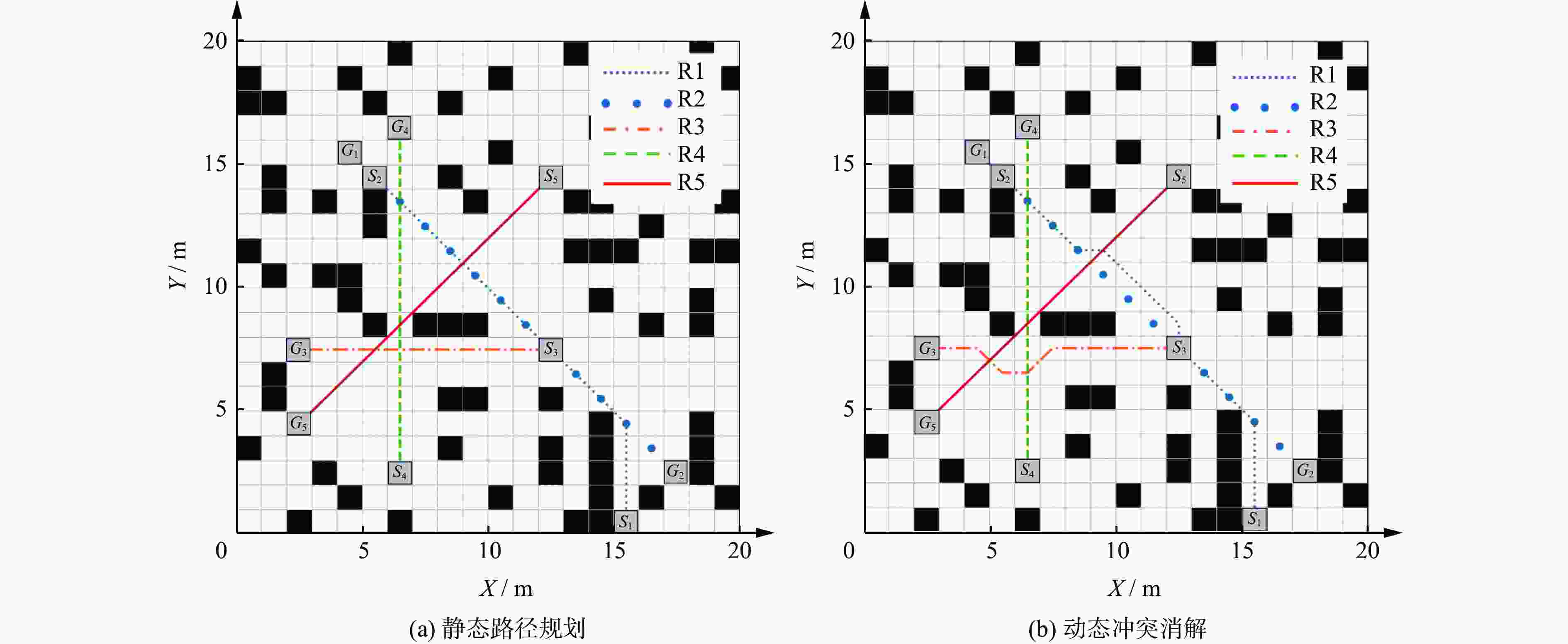 机器人 起点位置 终点位置 优先级 R1 (15.5, 0.5) (4.5, 15.5) 1 R2 (5.5, 14.5) (17.5, 2.5) 2 R3 (12.5, 7.5) (2.5, 7.5) 3 R4 (6.5, 2.5) (6.5, 16.5) 4 R5 (12.5, 14.5) (2.5, 4.5) 5 -