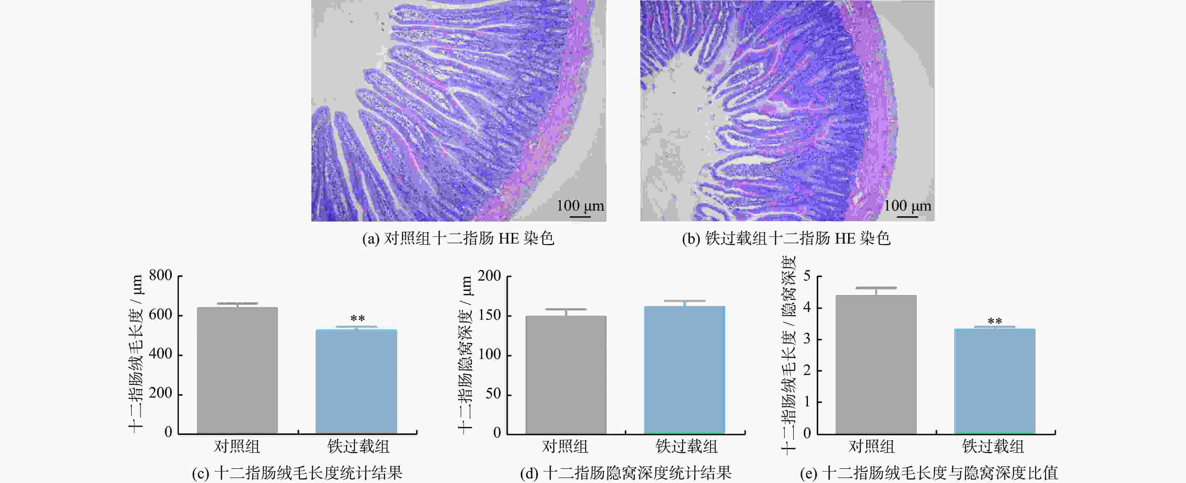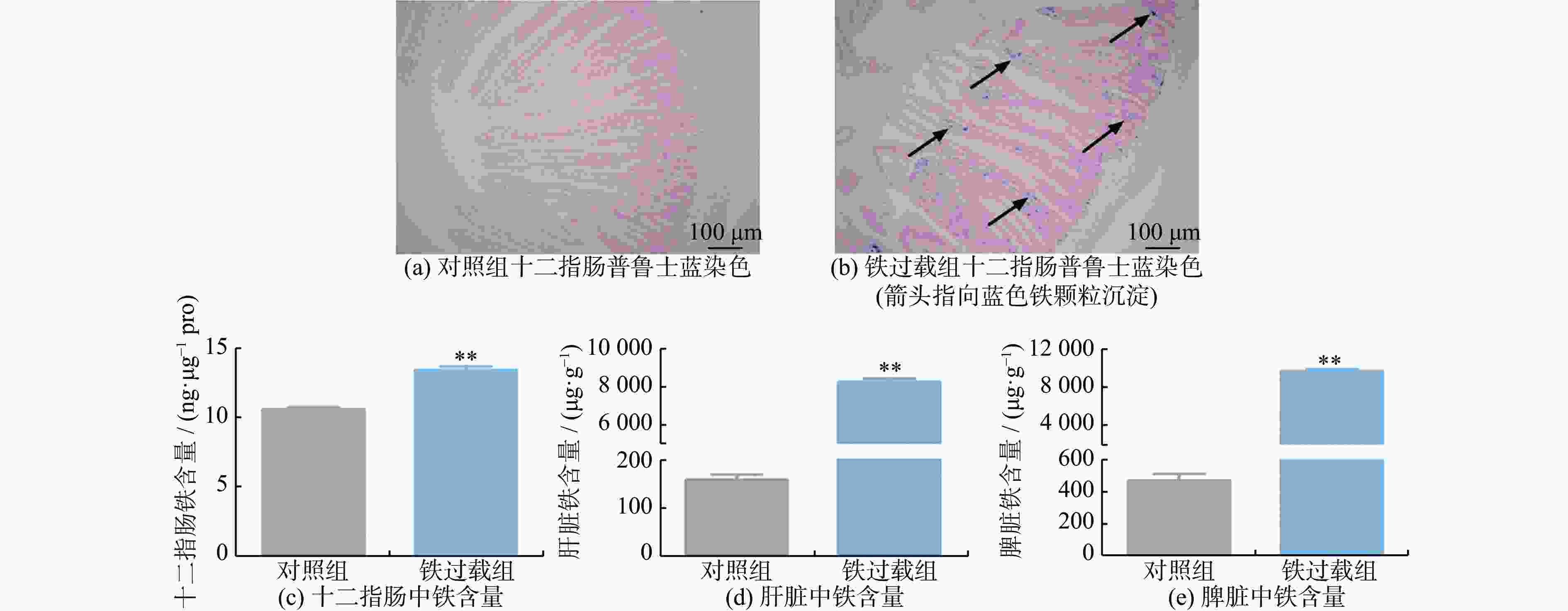 摘要: 铁是维持各种生理功能所必需的微量营养素,但过量的铁因其氧化还原活性具有高度毒性。将6 ~ 7周龄雄性SD大鼠随机分为对照组和铁过载组,分别给予生理盐水和150 mg/kg右旋糖酐铁连续处理4周。结果发现,铁过载显著降低大鼠体质量,增加血清铁、转铁蛋白结合铁、铁蛋白含量和转铁蛋白饱和度。铁过载组大鼠十二指肠、肝脏和脾脏铁含量显著增加,而十二指肠绒毛长度及其与隐窝深度的比值显著下降。此外,铁过载大鼠表现出与吸收和储存相关的DCYTB、DMT1、FTL和FTH的表达上调,但FPN和血清铁蛋白水平没有显著变化。以上结果表明,铁过载通过上调十二指肠铁吸收和储存蛋白表达,诱发十二指肠铁沉积和肠道损伤,为铁过载引起的十二指肠健康问题提供了理论证据。Abstract: Iron is an essential trace element for various physiological functions, yet excessive iron is highly toxic owing to its redox activity property. Male Sprague-Dawley (SD) rats, aged 6~7 weeks were randomly divided into a control group and an iron overload group. They were administered either saline or 150 mg/kg iron dextran for four consecutive weeks. The results show that iron overload significantly reduced body mass and increased serum iron, transferrin-bound iron, ferritin levels, and transferrin saturation. Elevated iron contents were observed in the duodenum, liver, and spleen of iron overloaded rats, whereas duodenal villus length and the villus-length-to-crypt-depth ratio were significantly decreased. Furthermore, an upregulation of DCYTB, DMT1, FTL, and FTH associated with absorption and storage, was observed in iron-overloaded rats, yet no significant changes were found in ferroportin (FPN) or serum ferritin levels. These findings indicate that iron overload induces duodenal iron deposition and intestinal damage by upregulating the expression of duodenal iron-absorption and storage proteins, thereby providing theoretical evidence for duodenal health issues caused by iron overload.