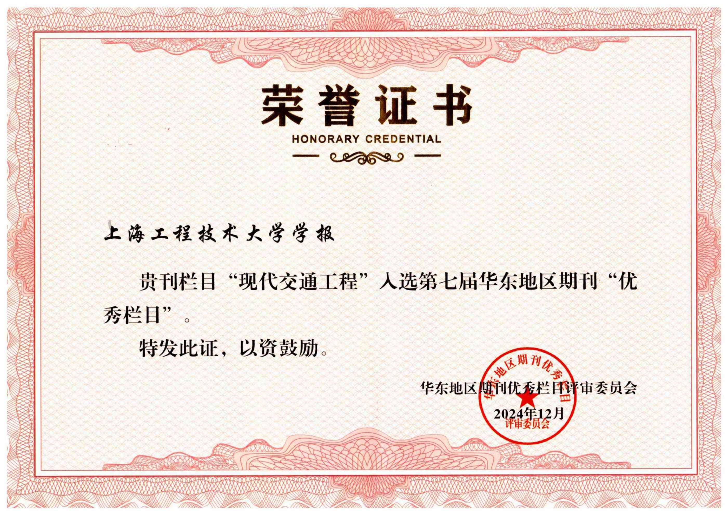 “现代交通工程”入选第七届华东地区期刊优秀栏目